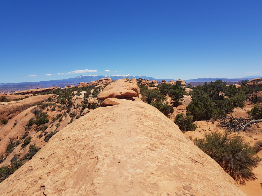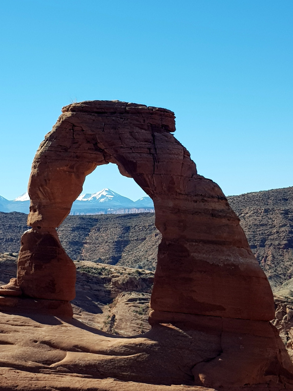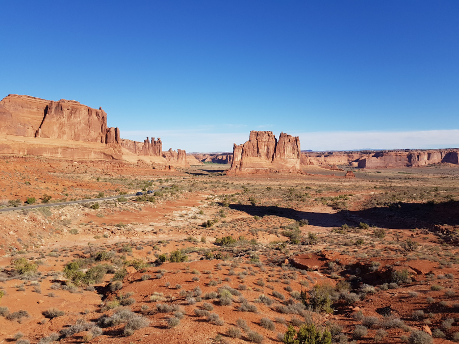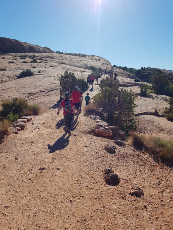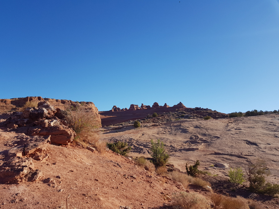 Начать я решила с самой популярной Delicate Arch. Не останавливаясь, поехала к ее парковке. Там уже все занято. Но если проехать еще милю, то можно припарковаться около "Вида на Деликатную арку", места, откуда до нее не добраться через каньон, но зато не надо шагать по горам. Это для автотуристов. Там на парковке места хватало, ну а лишняя миля по дороге в хорошую погоду это ничего.