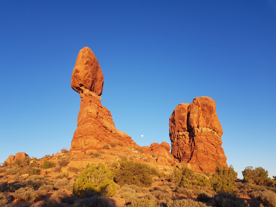 Вечера я решила дождаться около Balancing rock. Луна была почти полная. Телефон, как всегда, боле драматично передает цвета. Но цвет скалы минут за пятнадцать до заката на фотографии выглядел как он же на самом деле, но через эти пятнадцать минут. Закатная же фотография уходила в красное, даже показывать не буду.