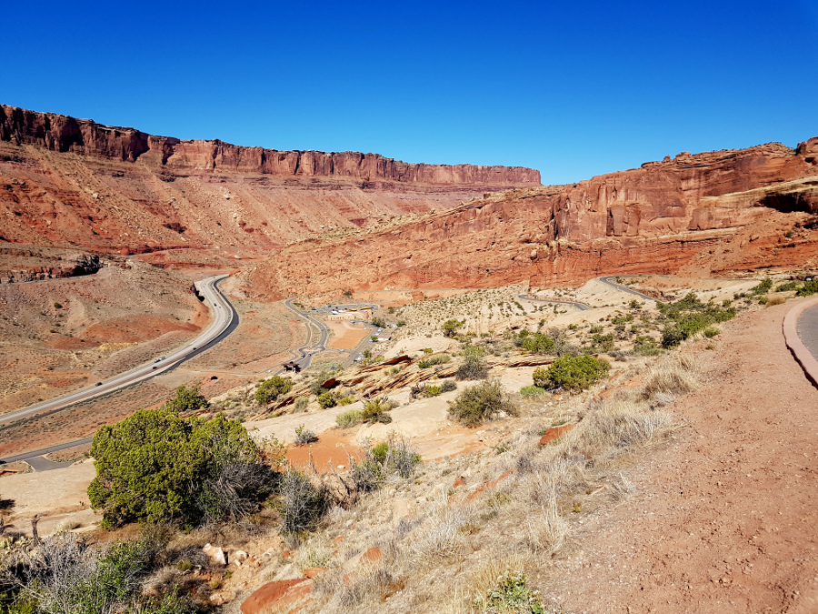С серпантина при входе виден центр, дорога внизу(по правой стороне) и Moab Fault (по левой стороне), этакий провал :) Разлом, на самом деле. Почти прямое шоссе - 191 трасса, на которой находится город Моаб. На противоположной от парка стороне разлома есть дорога, я все на нее косилась, нельзя ли заехать, но, кажется, нельзя. В той стороне и старые урановые шахты, и захоронение отвальной породы от разработок урана, и электрические подстанции. Рабочее местечко, не парк какой-нибудь :)