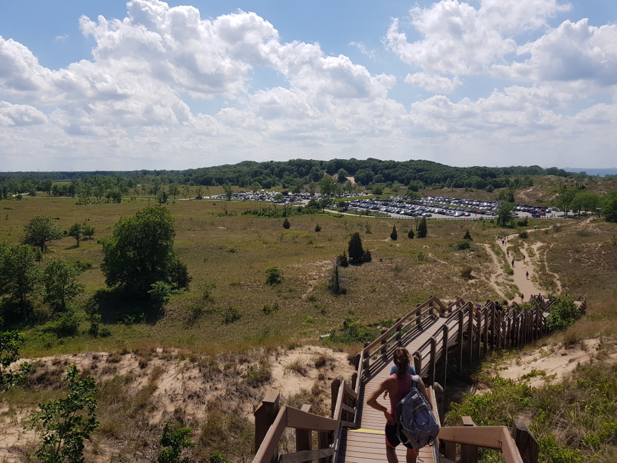 В случае Индианских дюн мне более понятно, почему их сделали национальным парком. Дюны вдоль озер - явление редкое и нестабильное. Снести их напрочь очень легко. Вот вид с одной дюны на другую, дальнюю. А парковка между ними находится в том месте, где в двадцатом веке срыли дюну ради производства стекла.