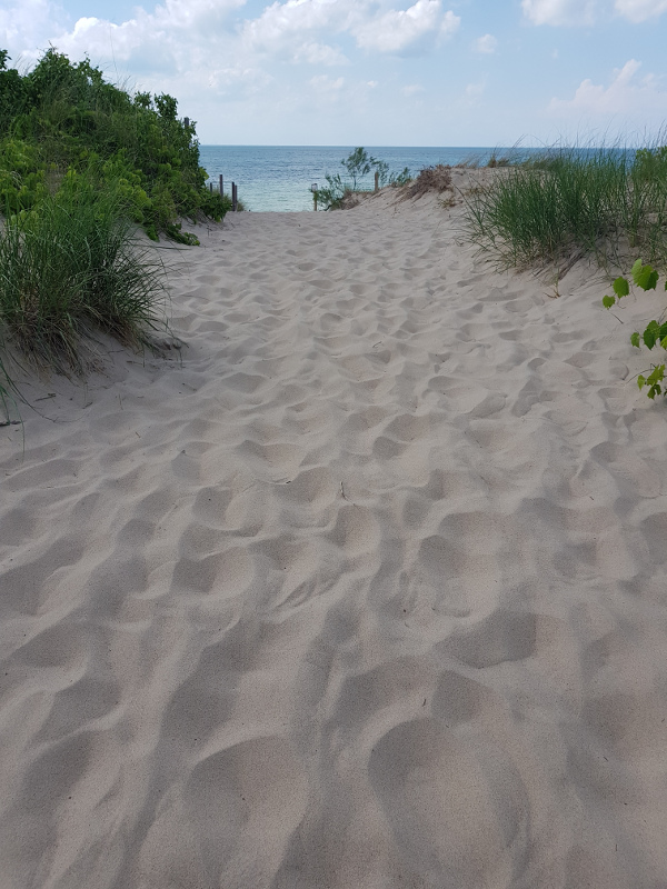 В воскресенье часам к восьми утра я приехала в парк штата, чтобы пройти их 3-Dune Challenge: подняться по очереди на три дюны. Они высотой метров по пятьдесят над уровнем озера каждая, но в промежутках между ними не надо опускаться так низко. Поэтому взбираться на них не очень сложно, невзирая на песок и на пугалки, которыми снабжены все описания. К тому же предыдущим вечером прошел сильный дождь, разгладив песок, а утром передо мной туда поднялись несколько человек, и были видны отчетливые следы, а по ним подниматься гораздо легче.