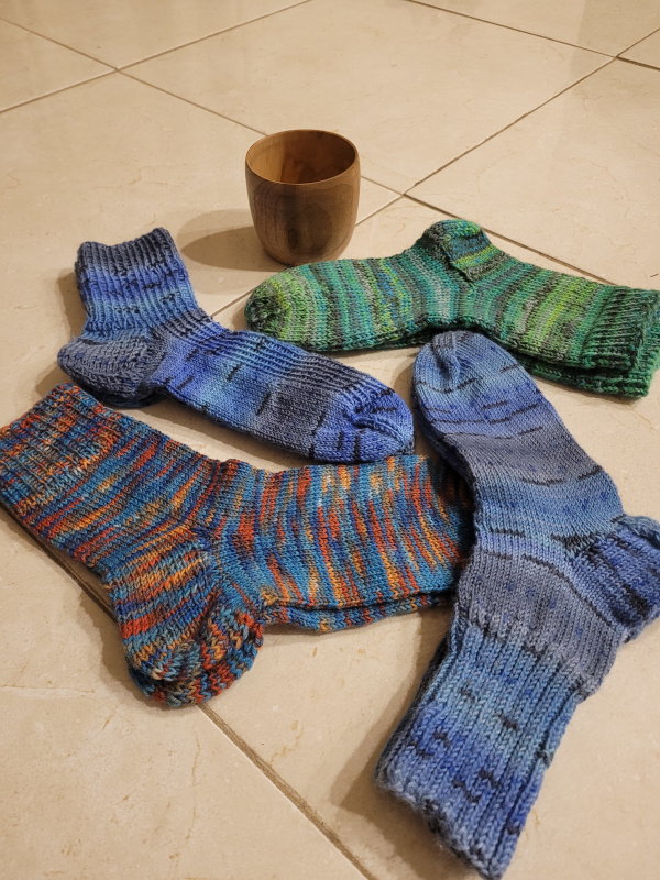Этой зимой к станку почти не подходила и сделала только одну завалящую баночку. Эскапировать пришлось в вязание. Половину носков уже отдала, это вторая половина.