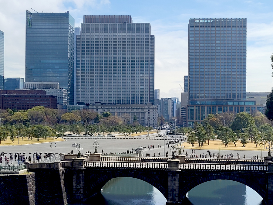 Вид на центр Токио и главный императорский мост. Мост рабочий. Народ, как нам сказали, не особо предупреждают о времени выезда императорский семьи, но как только там происходит движение, люди сбегаются, их рядом с дворцом всегда много.