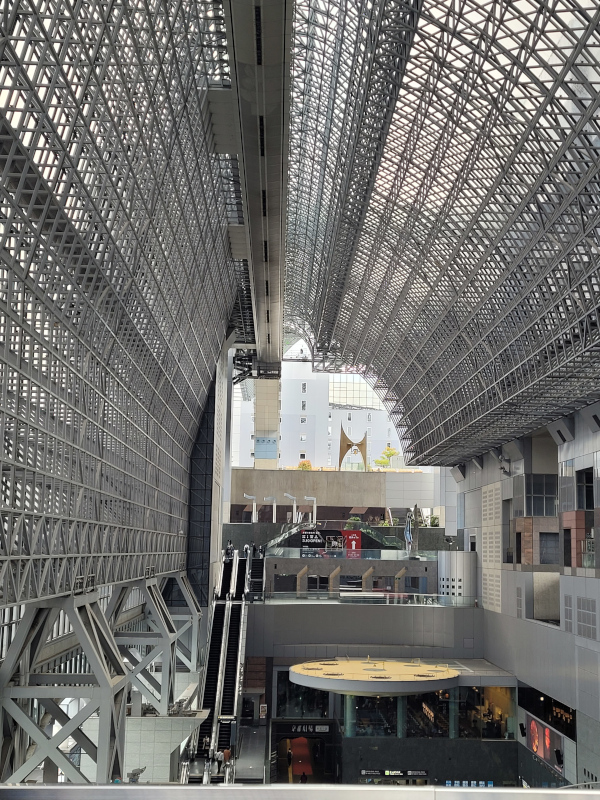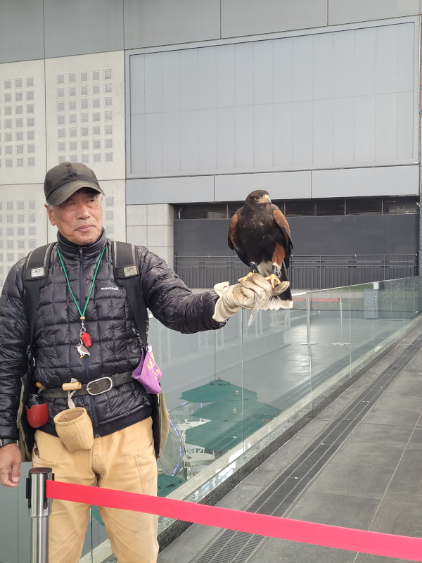 Железнодорожный вокзал в Киото новый, красивый и ужасно сложный. Мы приехали туда заранее понаслаждаться архитектурой, а заодно увидели как под потолком летает кречет. Я сначала думала, что какая-то птица нечаянно залетела, ан нет. Хозяин перед уходом разрешил себя сфотографировать.